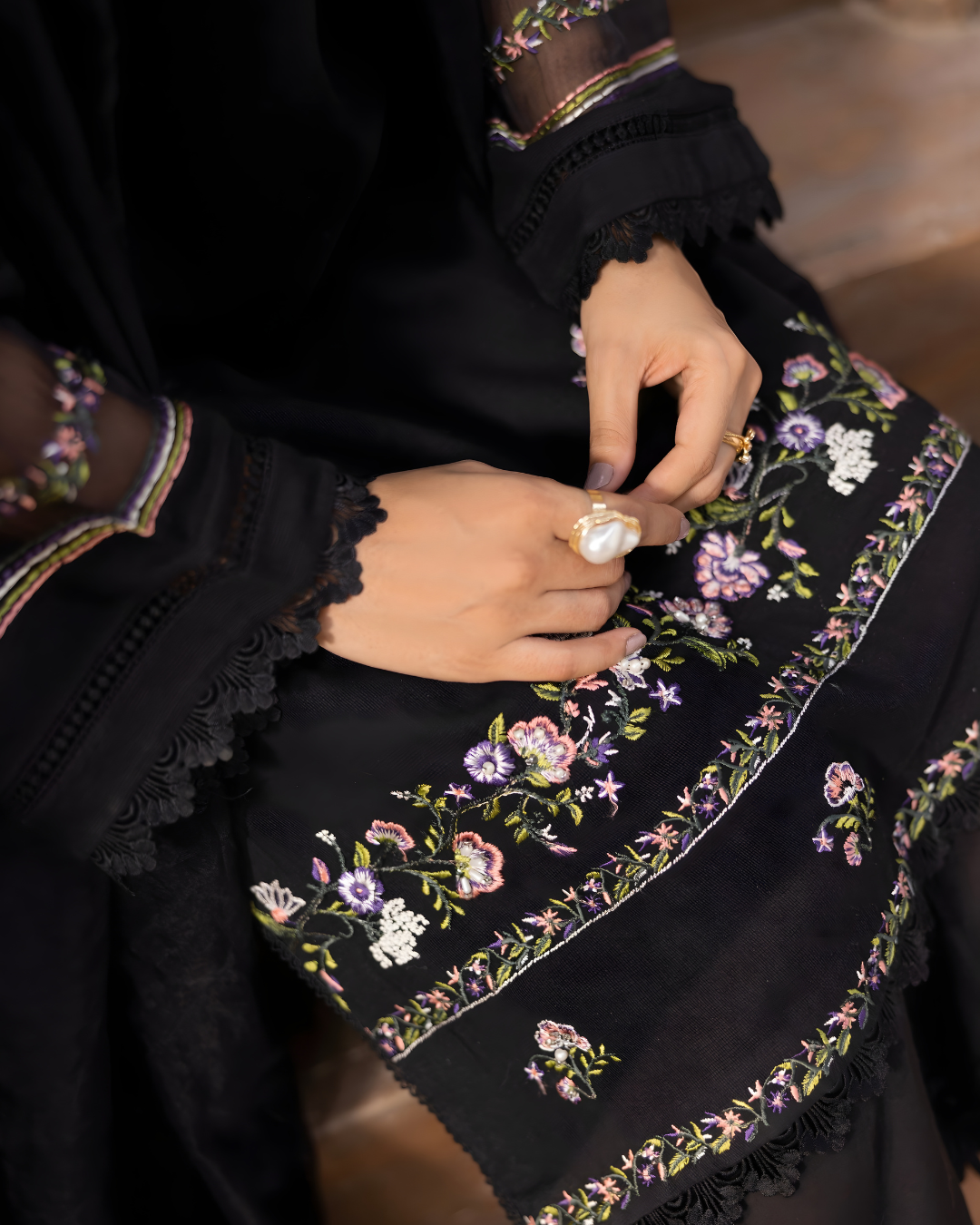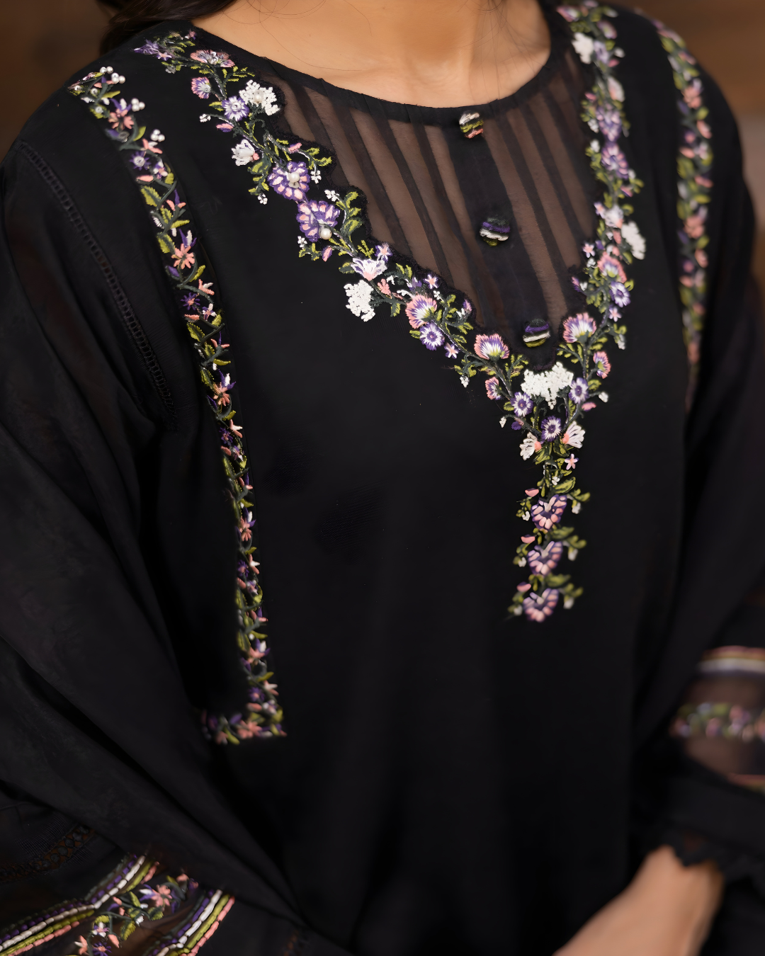 - A black embroidered three-piece ensemble defined by understated elegance and refined detailing.