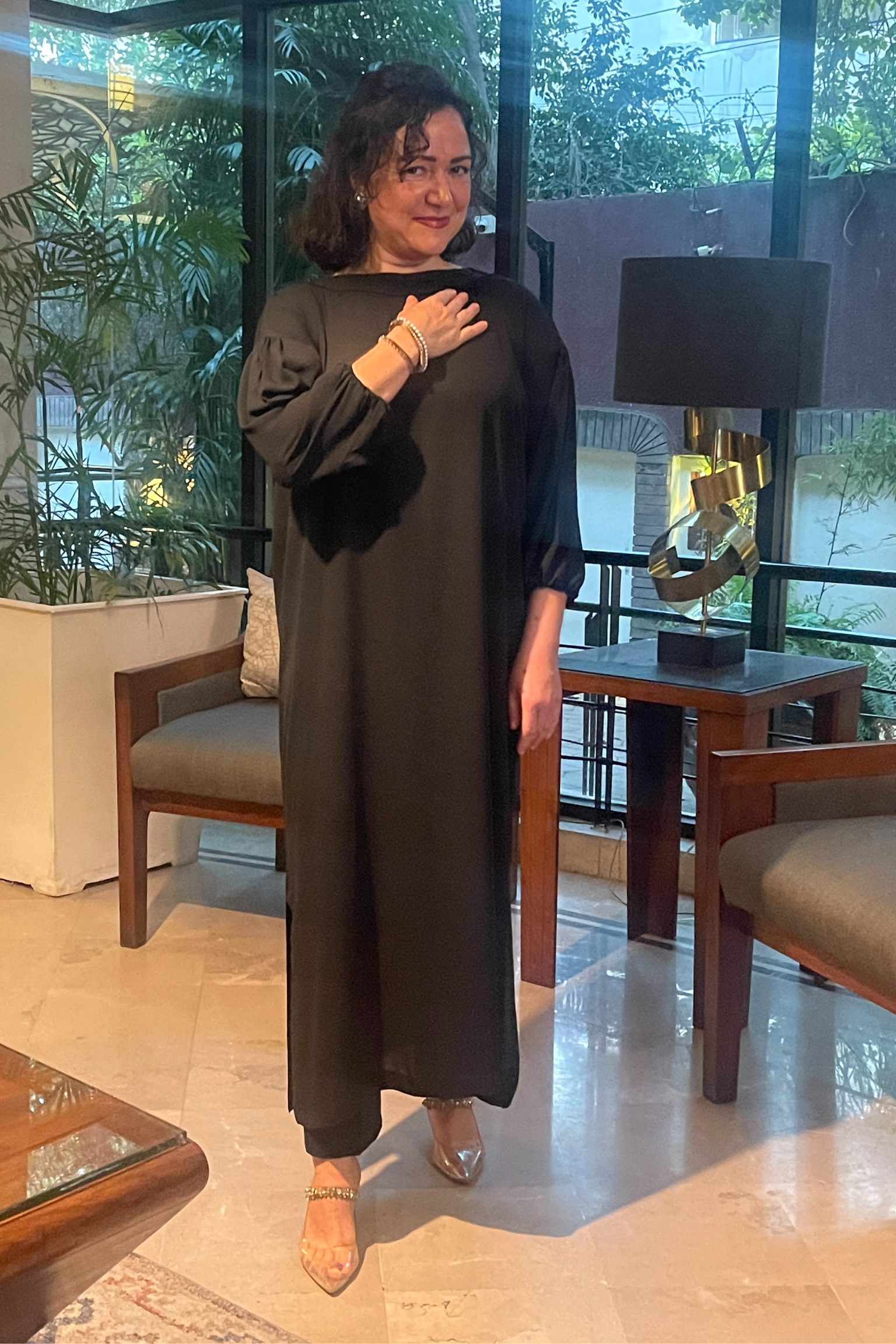 - Make a bold statement with this neon kaftan dress, featuring a sophisticated ban tie-knot neckline, off-shoulder gathered sleeves, and sleek chocks,