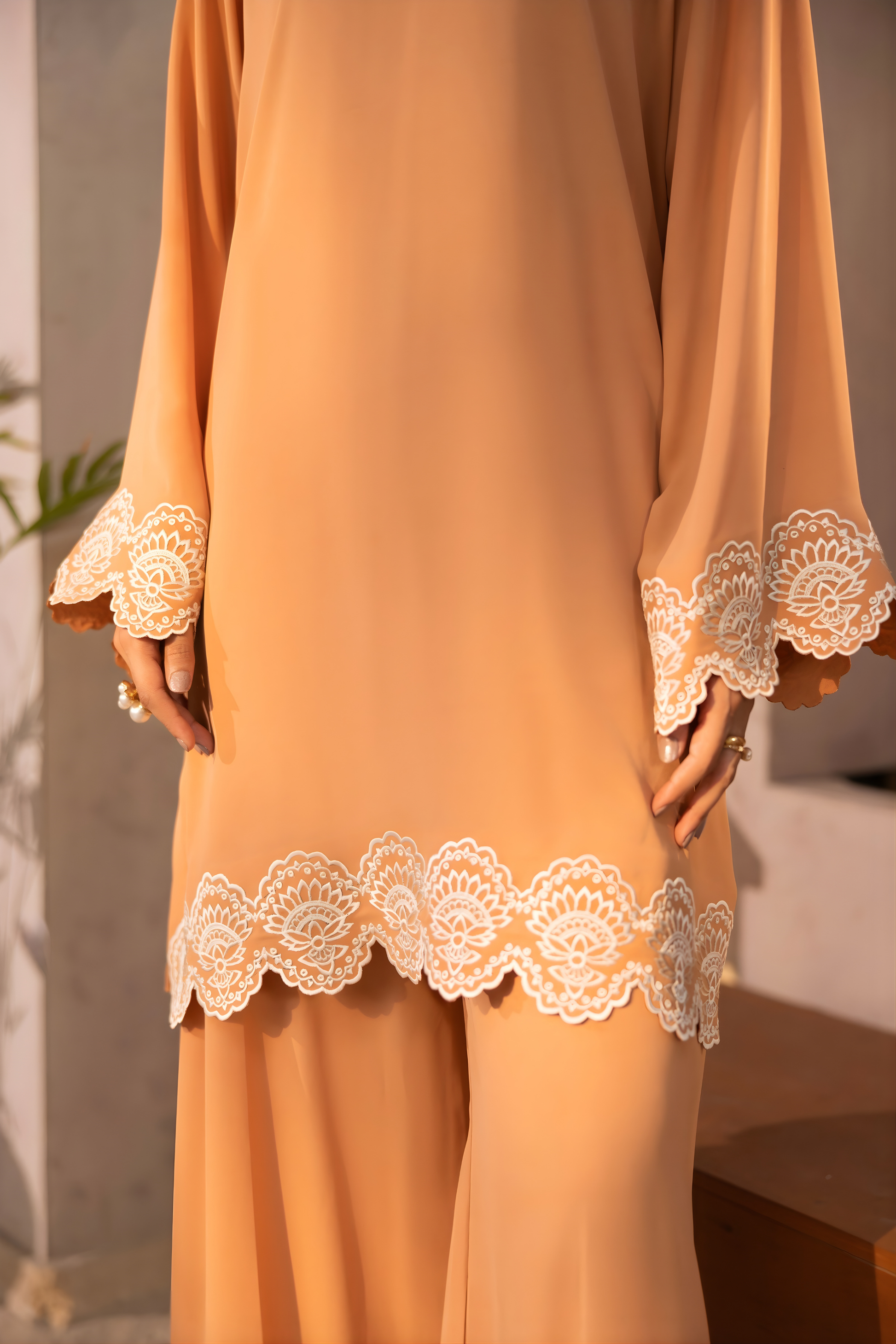 - A peach blush two-piece set crafted in fluid georgette, detailed with delicate lace embroidery along the hem and sleeves.